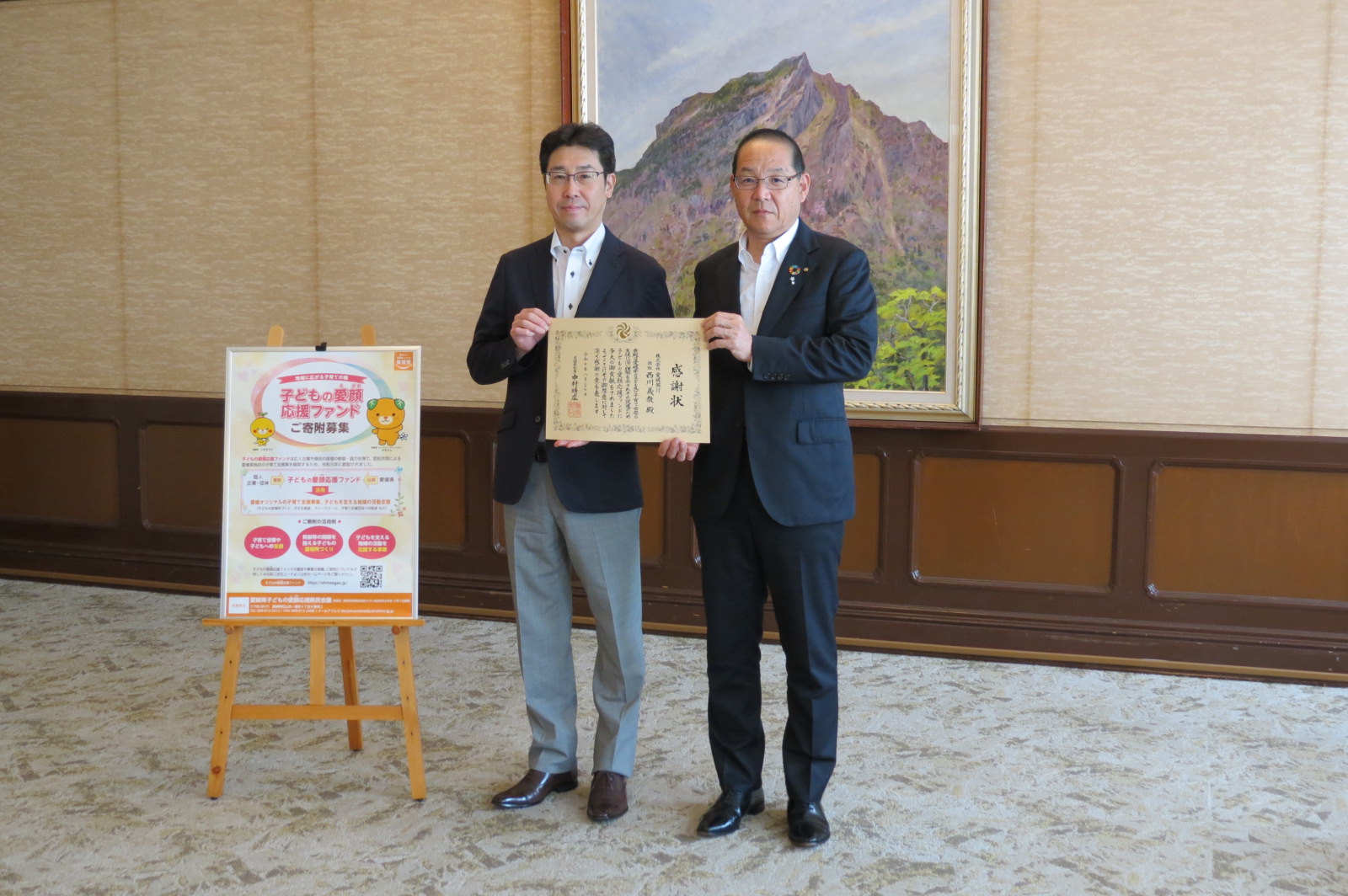 2025年8月27日、子どもの愛顔応援ファンドの感謝状贈呈式を県庁で行い、菅副知事から株式会社愛媛銀行副頭取 豊田 将光 様(写真右)に感謝状を贈呈しました。