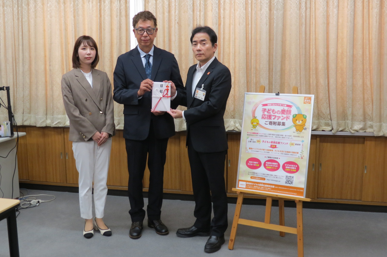 2025年9月25日、子どもの愛顔応援ファンドへの寄付金贈呈式を県庁で行い、松山シーサイドカントリークラブ(西武観光株式会社)代表取締役社長 藤井 伸忠様(写真中央)から森居人口減少対策統括部長へ目録が手渡されました。本寄附は、9月6日(土)に開催された「第5回 企業対抗チャリティゴルフコンペ」の一環として行われるものです。