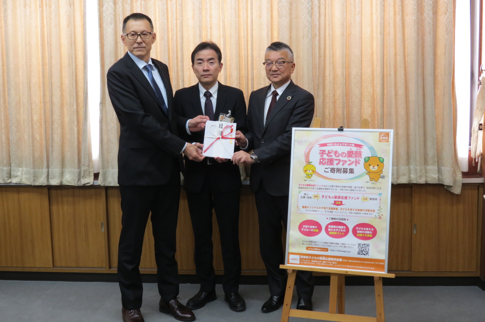 こくみん共済coop愛媛推進本部様と四国労働金庫愛媛地区推進委員会様から子どもの愛顔応援ファンドへの寄付金贈呈式